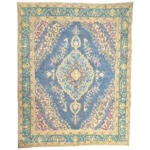 380 x 289cm Blue Yellow Hand Knotted Ultra Vintage Persian Wool Rug