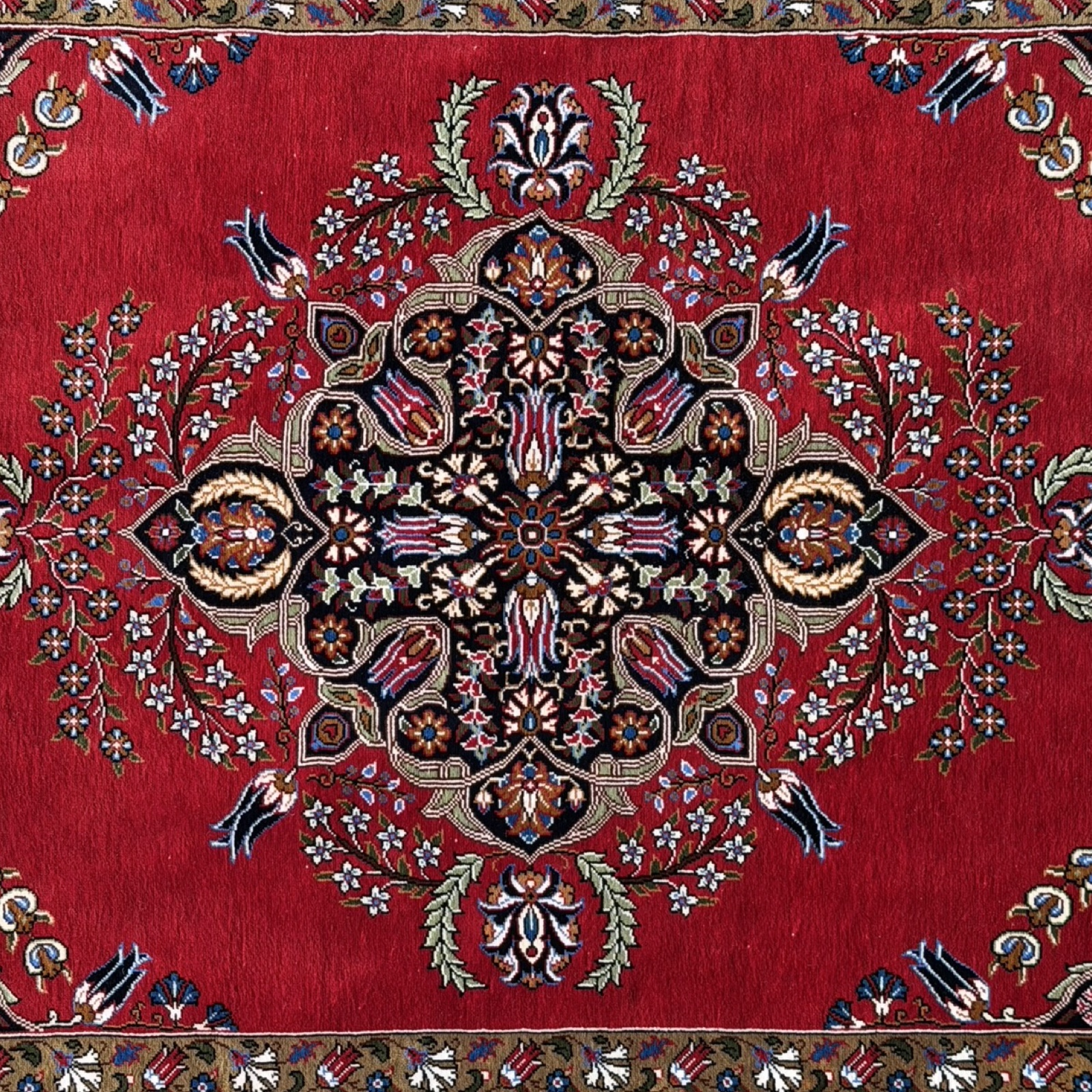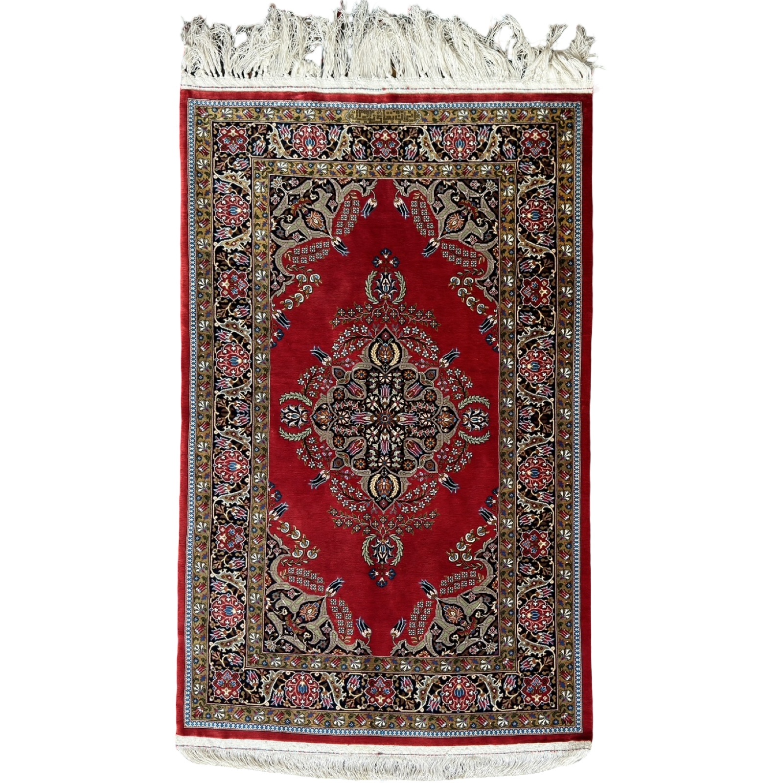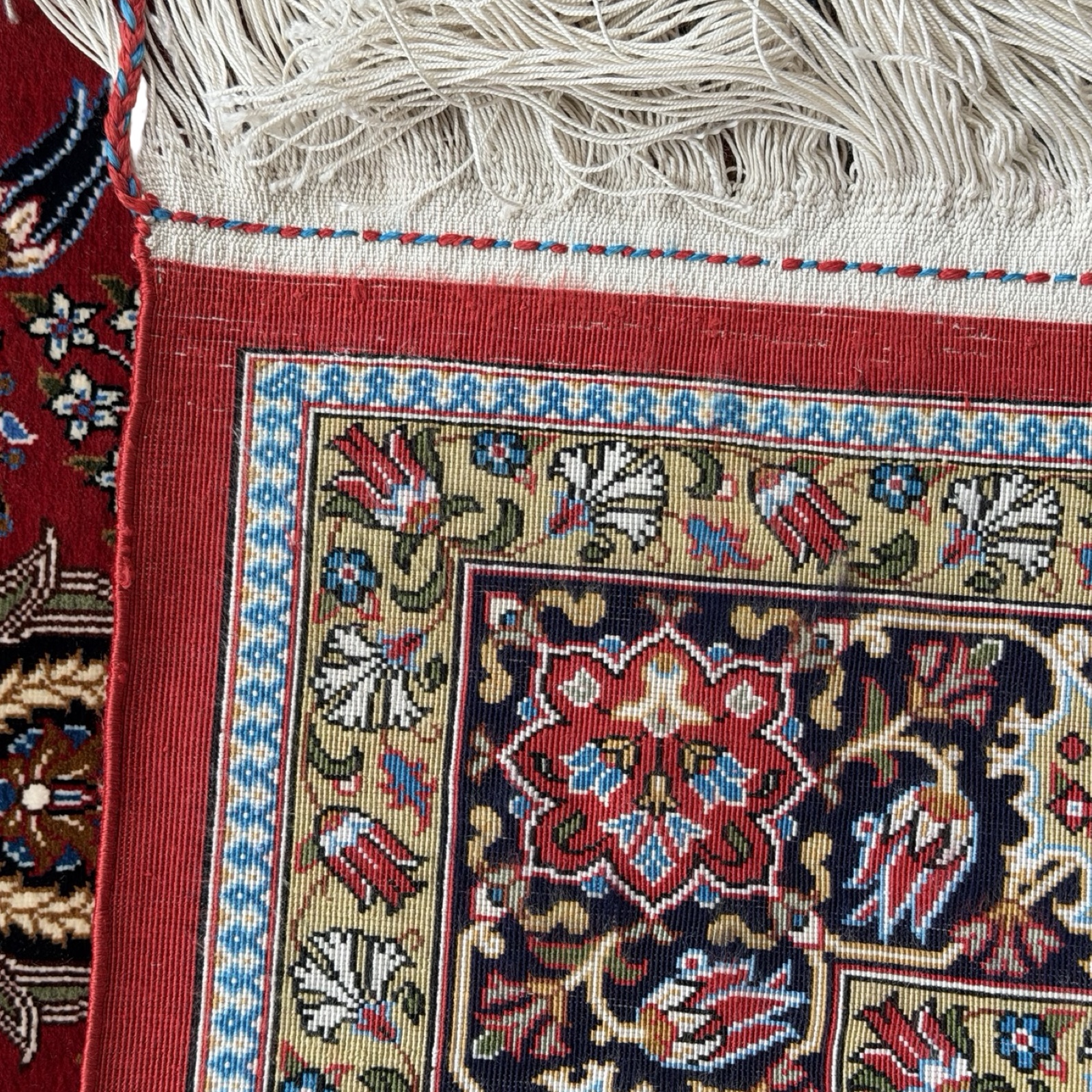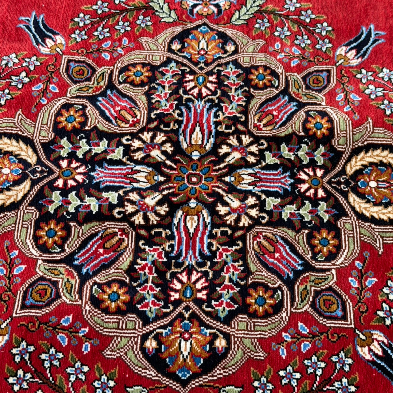 This is a 100% pure silk hand-knotted rug from Qum, Iran, woven with exceptional fineness and artistic detail. The intricate Floral composition and rich colour work reflect the high level of craftsmanship Qum silk rugs are known for. Due to its fine silk structure and small size, this piece is intended primarily for wall display as a textile artwork.