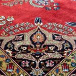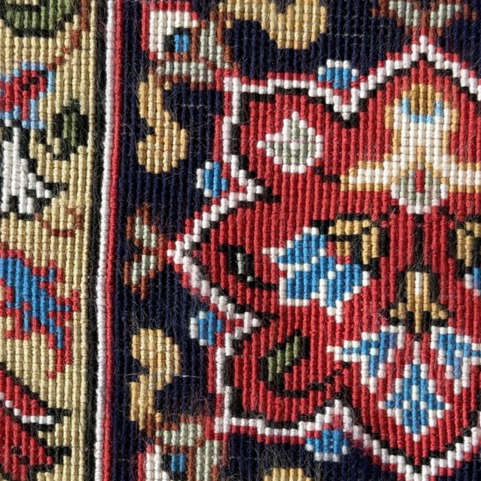 The rug carries a woven inscription that includes the year 1292 (Solar Hijri), which corresponds to 1913–1914 in the Gregorian calendar. This indicates the actual age of the rug, making it approximately 113 years old as of 2026. The inscription also includes a maker’s signature, confirming its Iranian origin and authenticity.