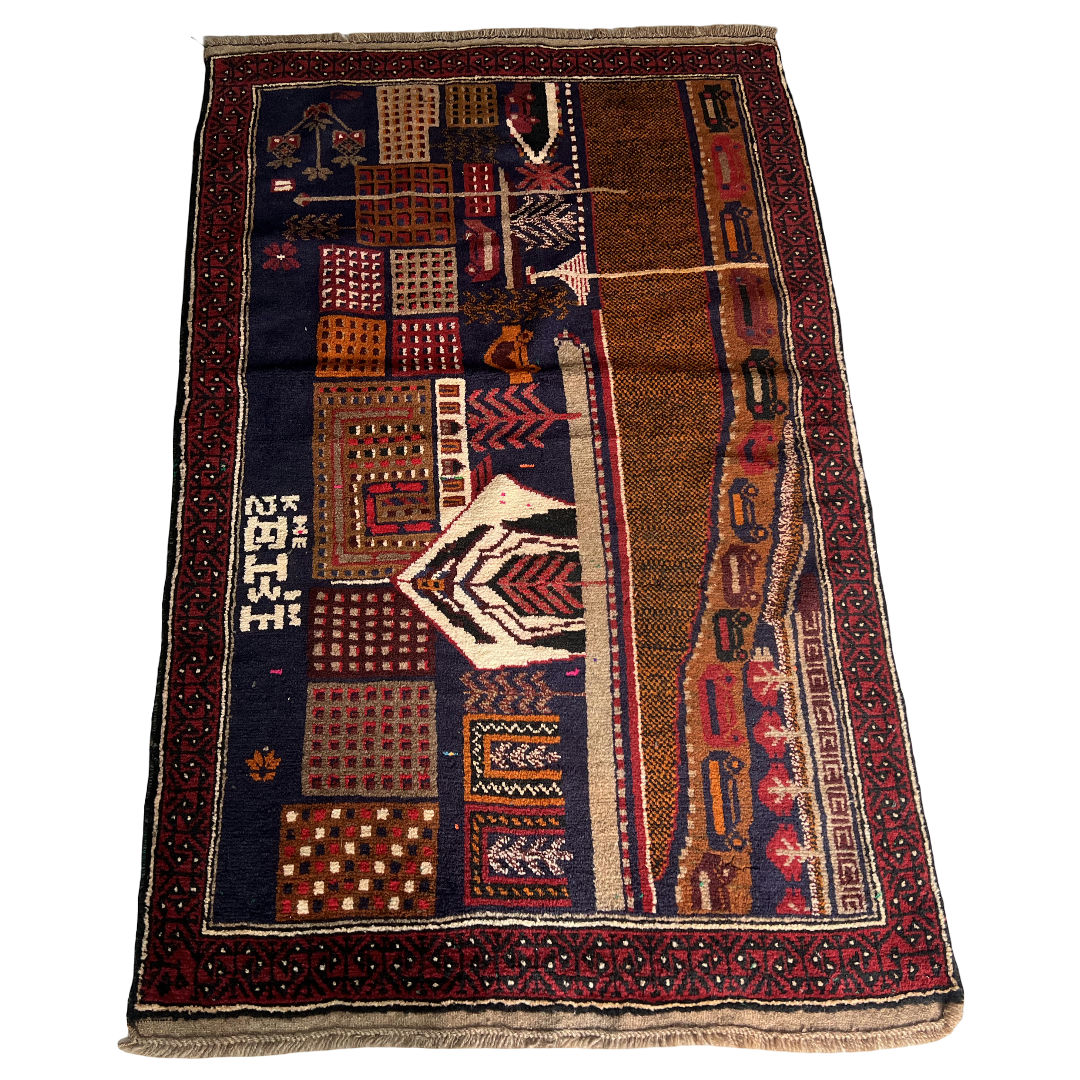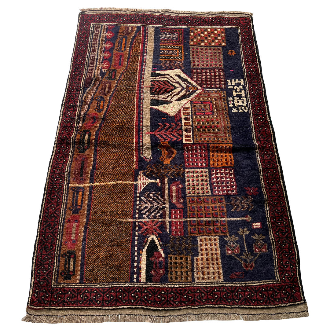 Afghan Baluch rugs are hand-knotted tribal weavings made by Baluch tribes in western Afghanistan, admired for their earthy tones, durability, and cultural authenticity. Typically woven with a soft wool pile on a wool or cotton foundation, they feature motifs such as prayer niches, geometric medallions, tree of life patterns, and stylized florals. Their color palette is dominated by deep browns, rich reds, dark blues, and ivory accents, traditionally achieved with natural dyes. Often made in smaller formats, Afghan Baluch rugs serve beautifully as prayer rugs, accent pieces, or collector’s items. Each piece reflects the nomadic heritage of its weaver, with subtle irregularities and a warm, time-worn charm that makes them unique and highly sought after.