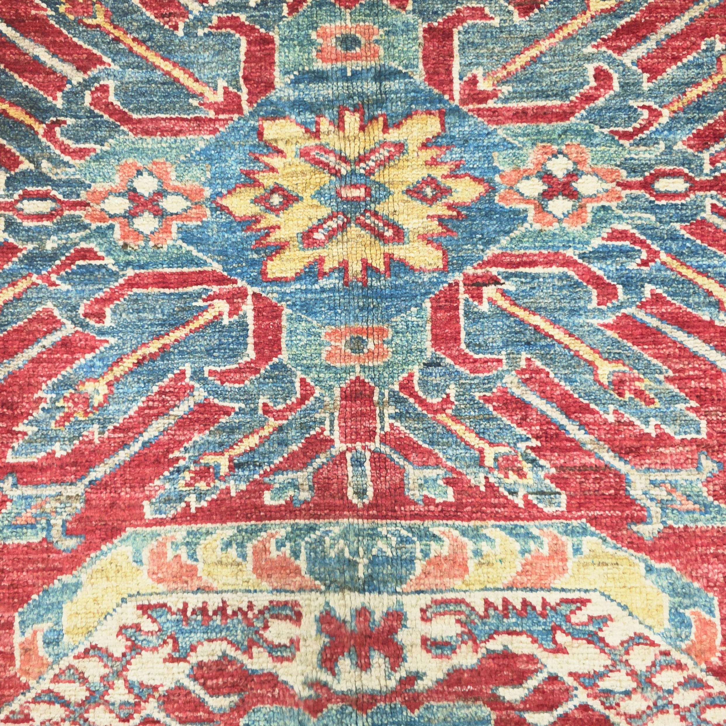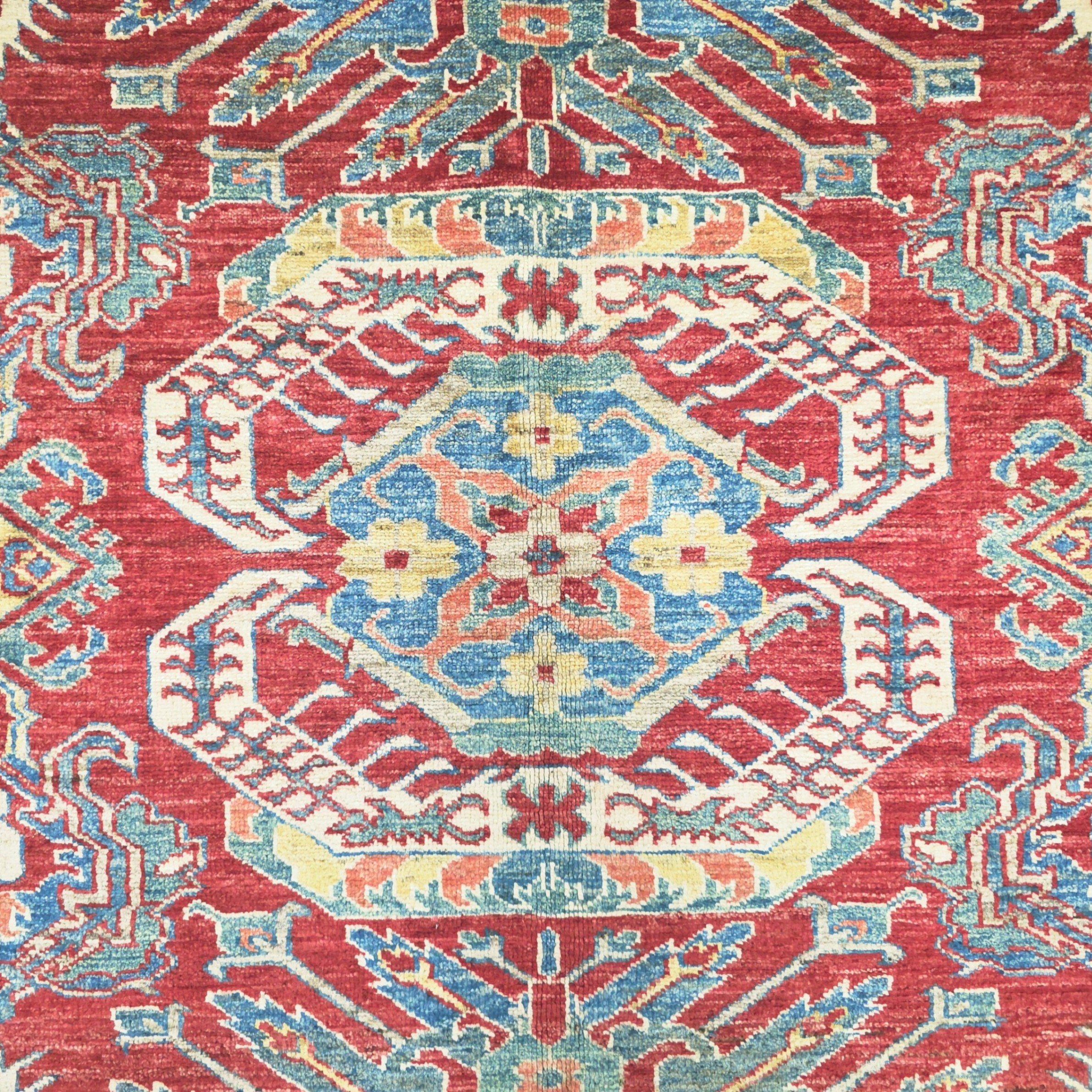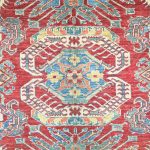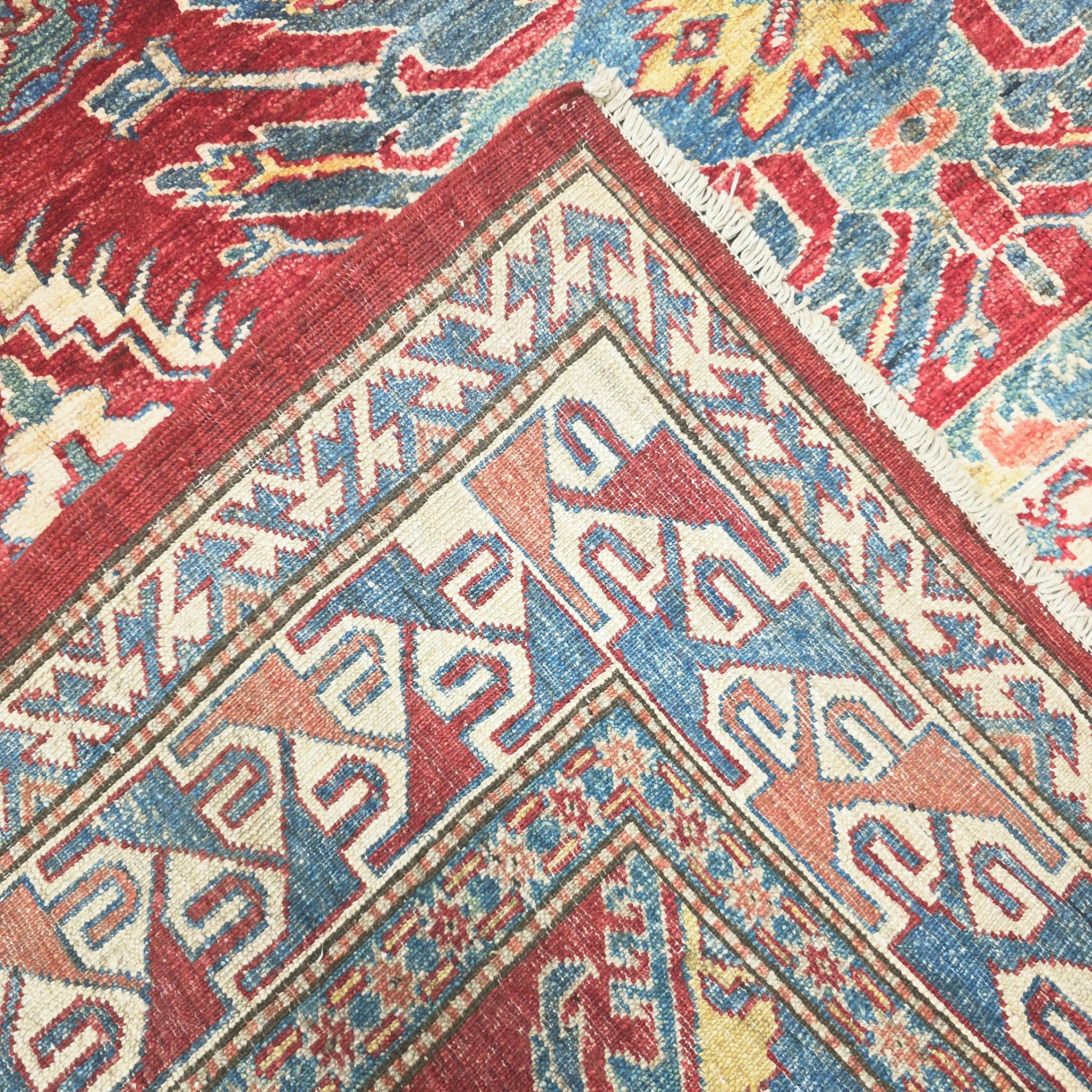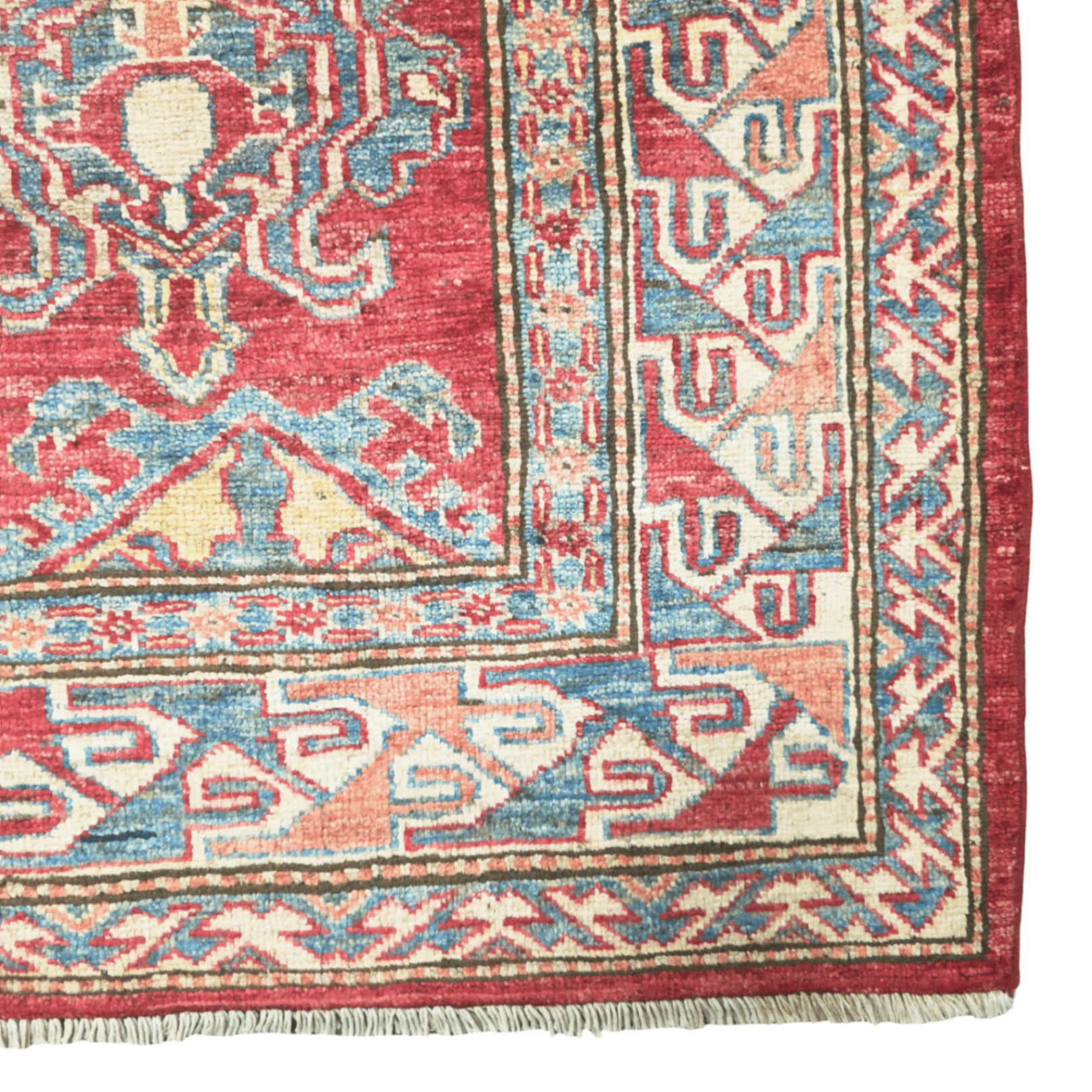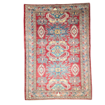 Kazak rugs are bold and striking hand-knotted tribal weavings from the Caucasus region, known for their geometric patterns and vibrant colors. Traditionally woven with high-quality wool on a cotton foundation, they feature large medallions, hooked polygons, stylized flowers, and tribal symbols that carry deep cultural meaning. The color palette is vivid and lively, often dominated by rich reds, deep blues, ivory, and touches of green or gold, achieved with natural dyes.