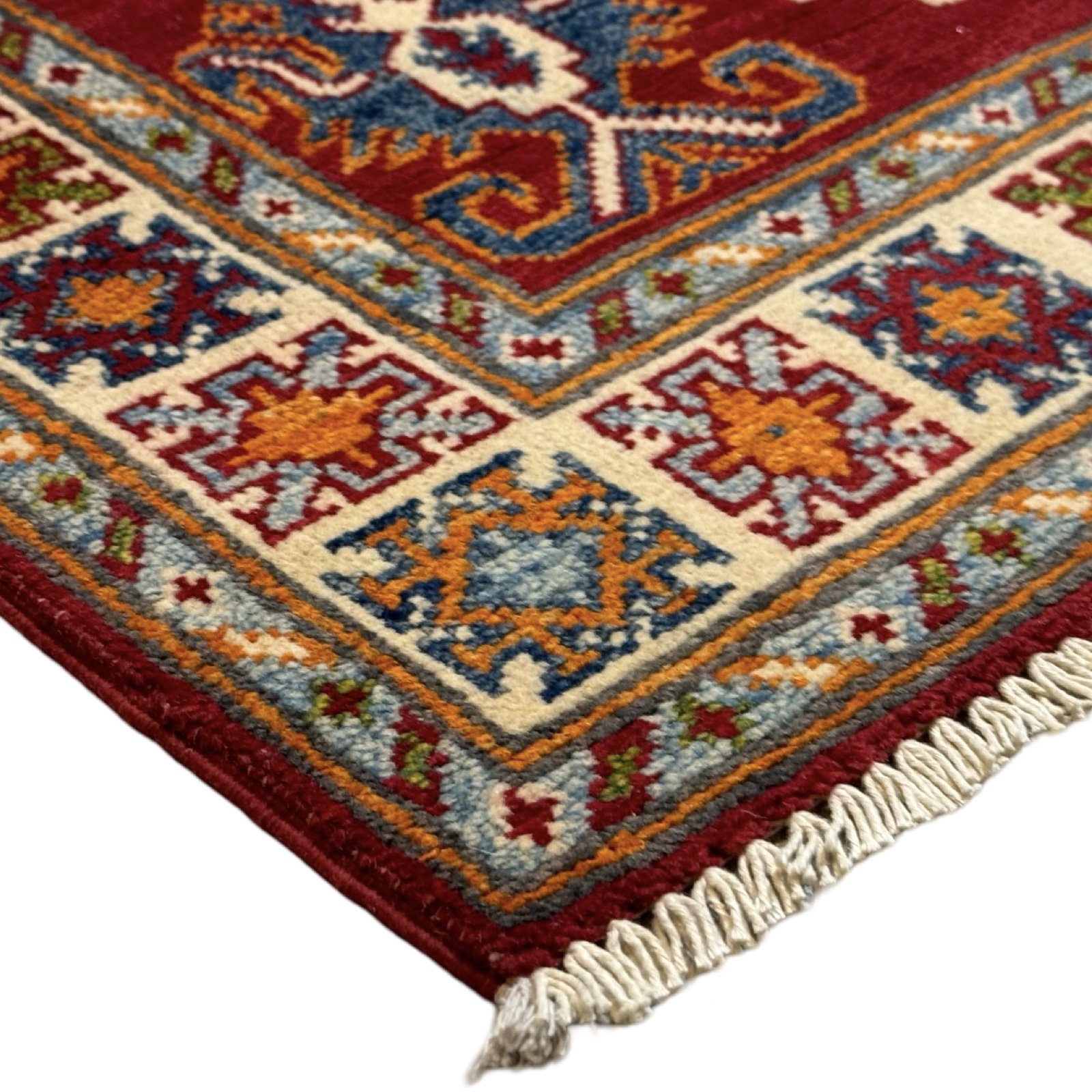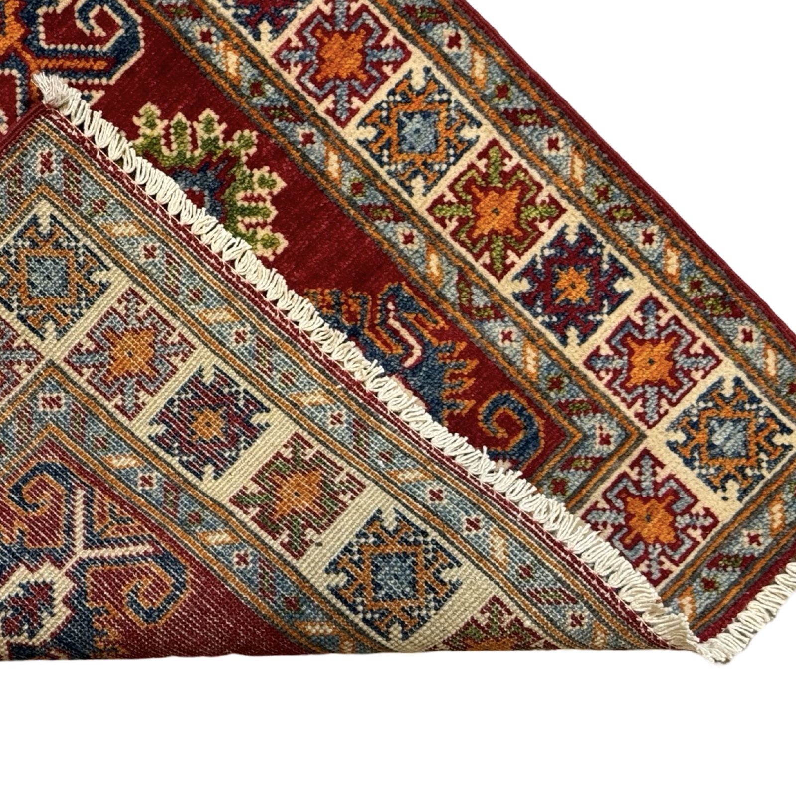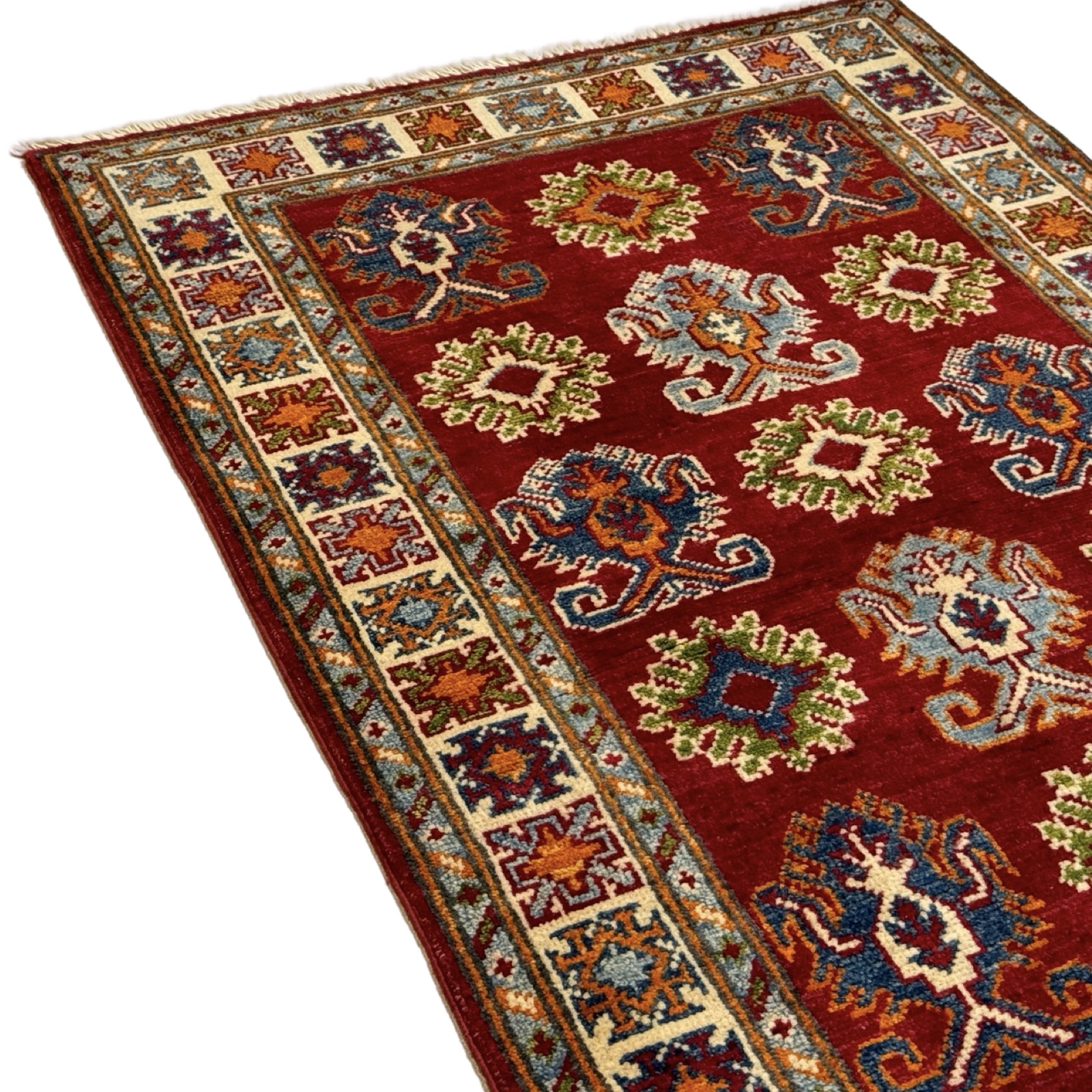 The Afghan Kazak rug is a hand-knotted treasure known for its bold geometric designs and vibrant colors. Made using traditional techniques and high-quality wool, this rug showcases the rich cultural heritage of the Caucasus region, offering durability and a striking aesthetic that enhances any space.