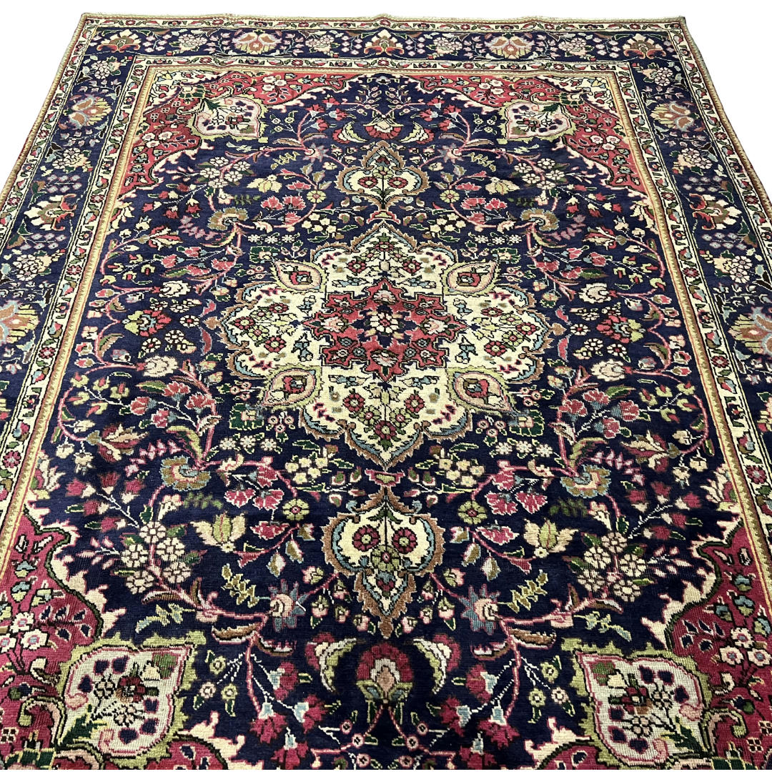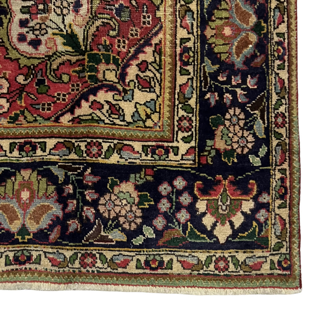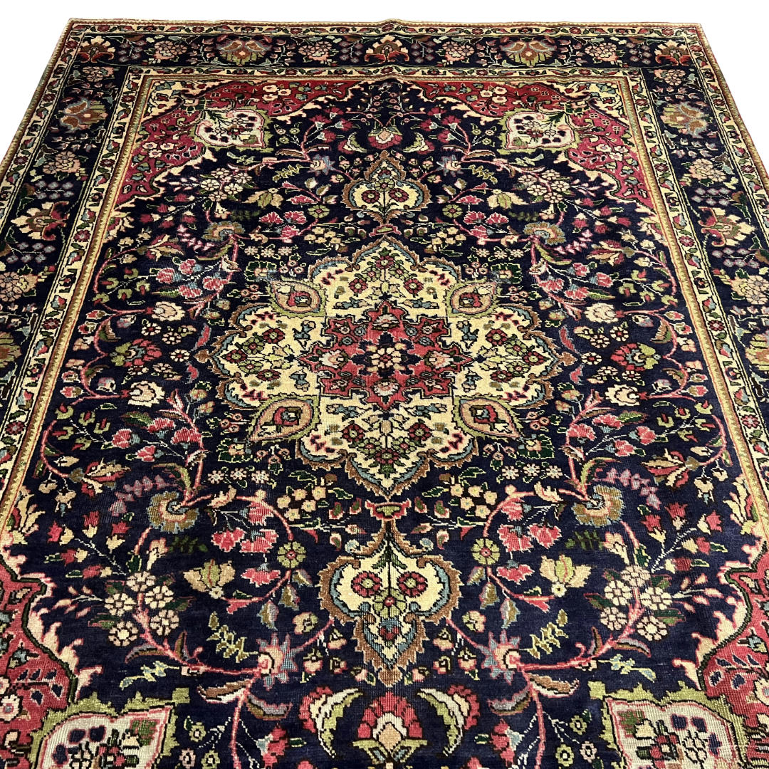 This Persian Kashan rug is a classic example of traditional Iranian craftsmanship, featuring a rich red field complemented by a deep navy border. The central medallion is beautifully detailed, surrounded by intricate floral vines that create a balanced and elegant composition.