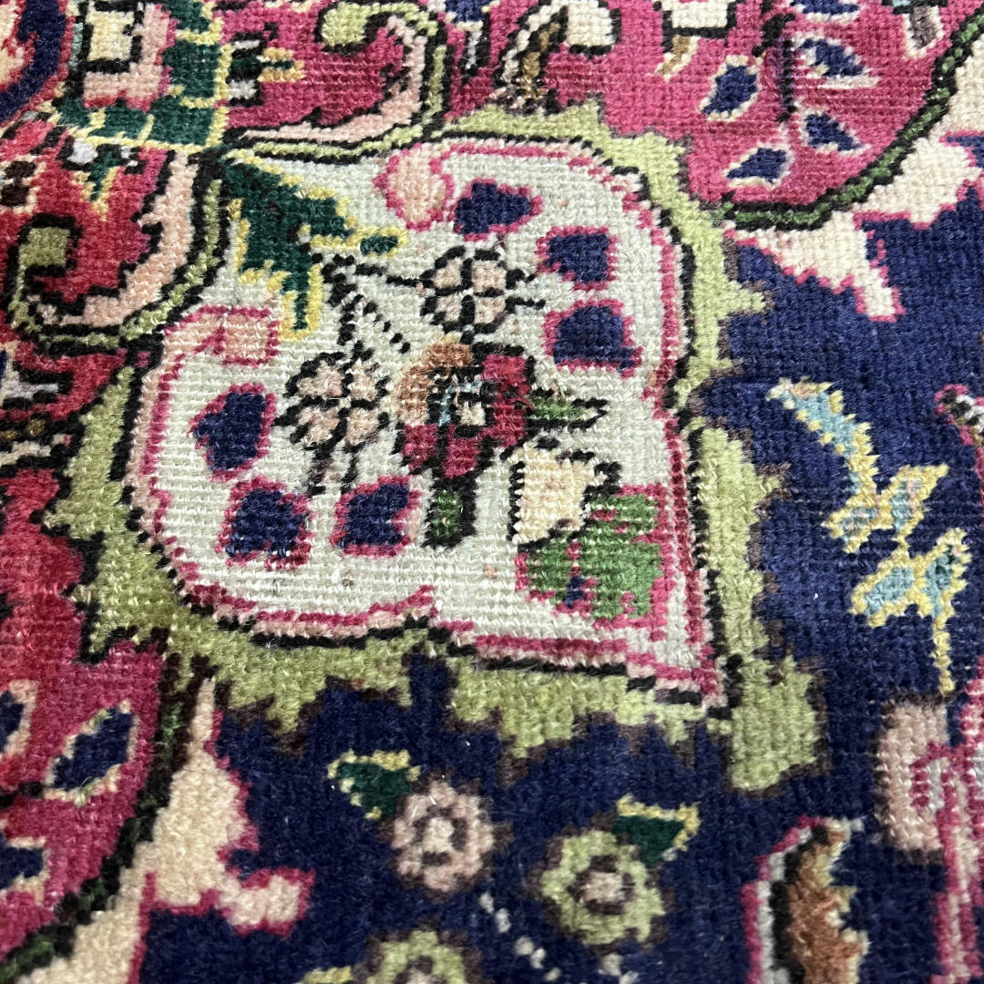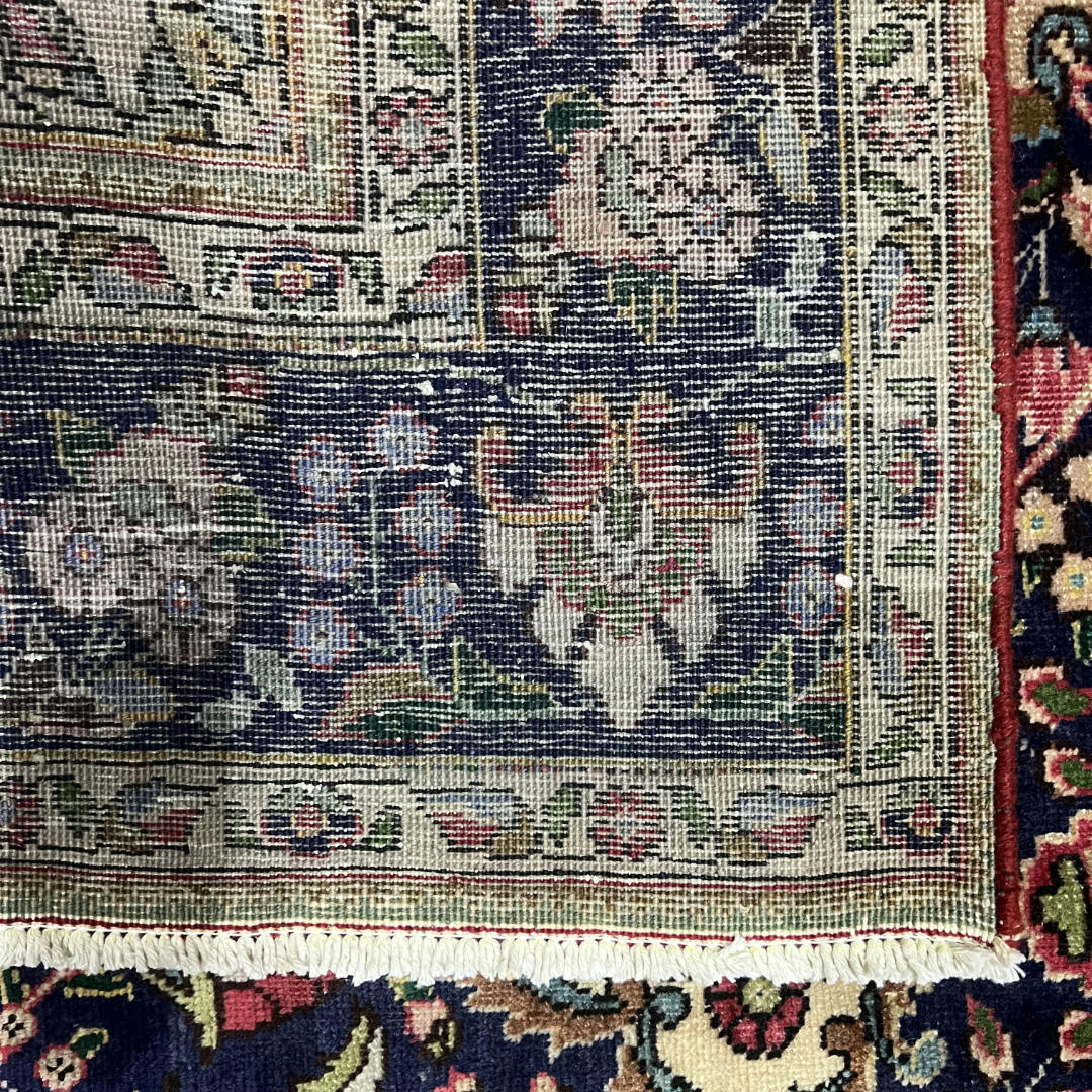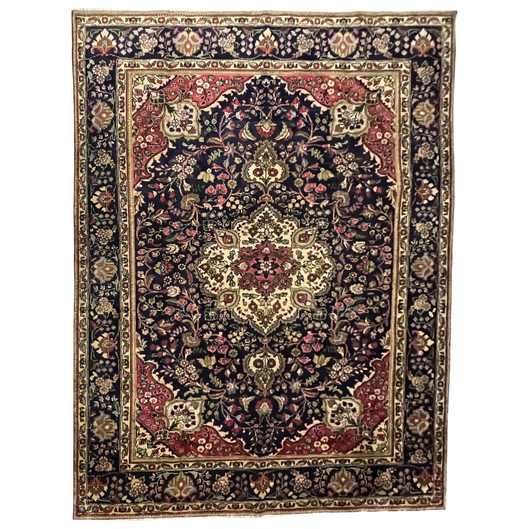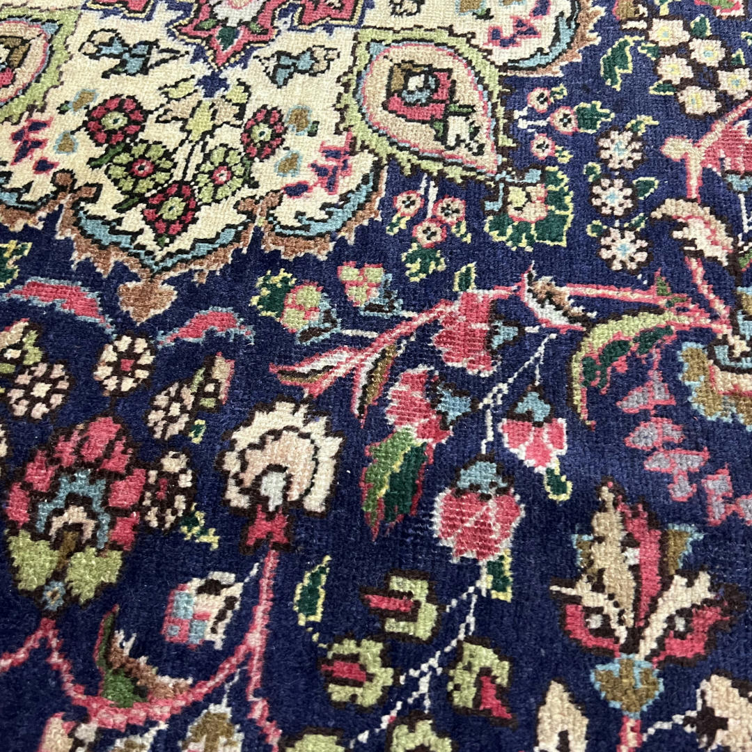 This Persian Kashan rug is a classic example of traditional Iranian craftsmanship, featuring a rich red field complemented by a deep navy border. The central medallion is beautifully detailed, surrounded by intricate floral vines that create a balanced and elegant composition.