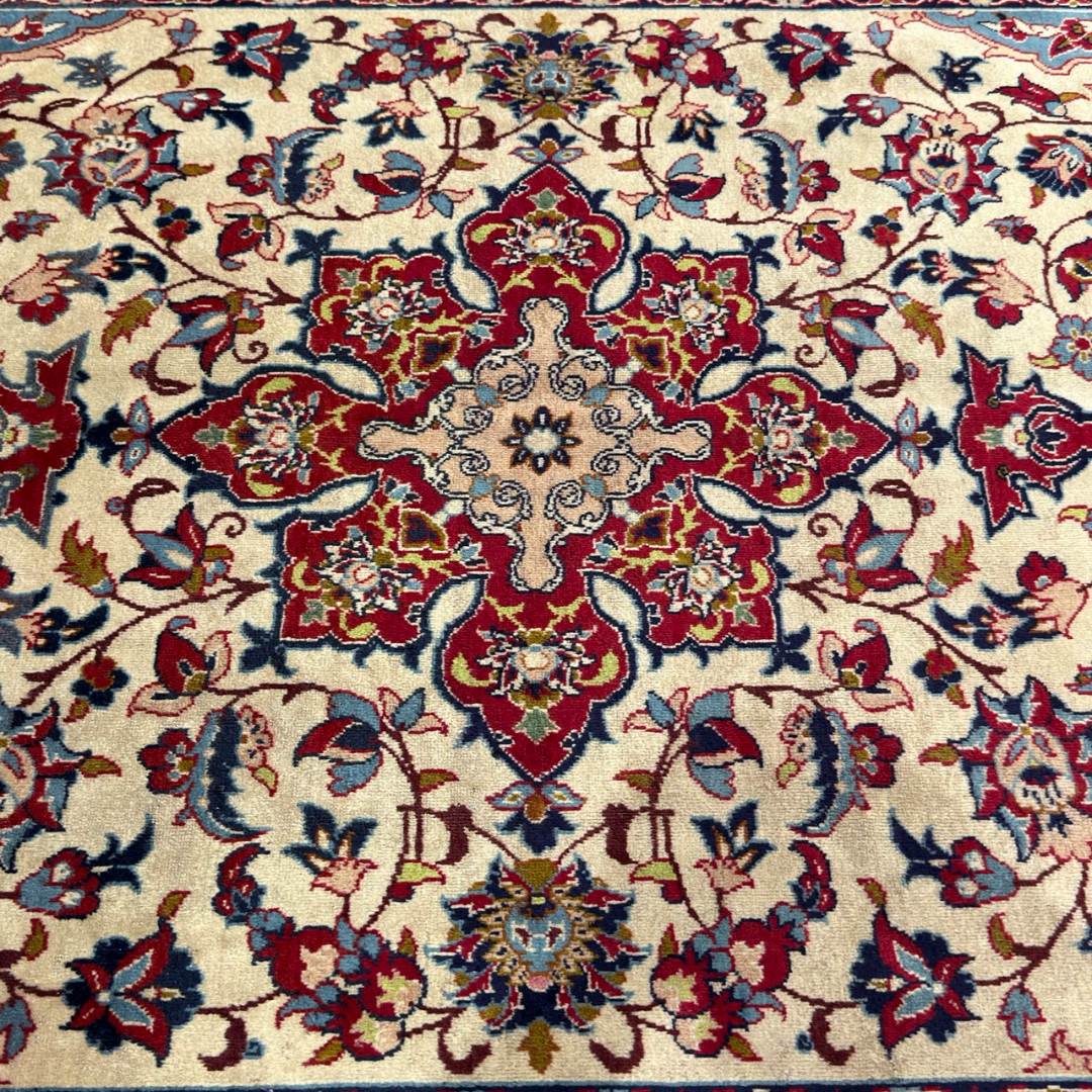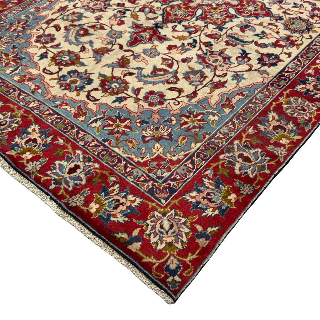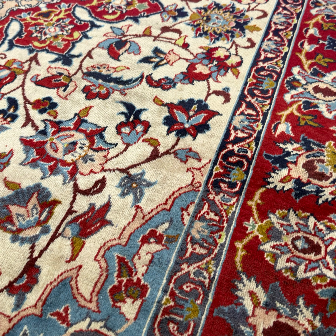 The combination of a warm red field with soft ivory and light blue accents gives the rug a refined yet vibrant look. Najafabad rugs are appreciated for their durability and slightly bolder structure compared to finer city weaves, making them ideal for everyday use.