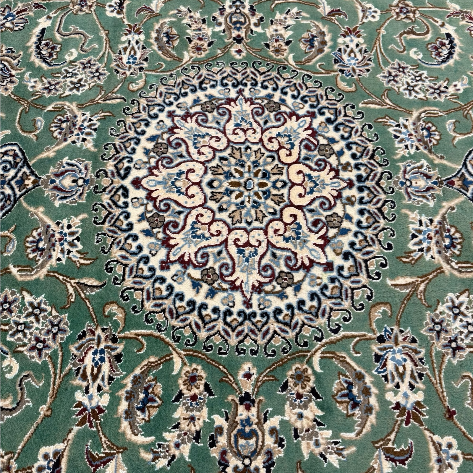 Be the first to review “285 x 198cm Hand Knotted Green Persian Nain Silk And Wool Rug”