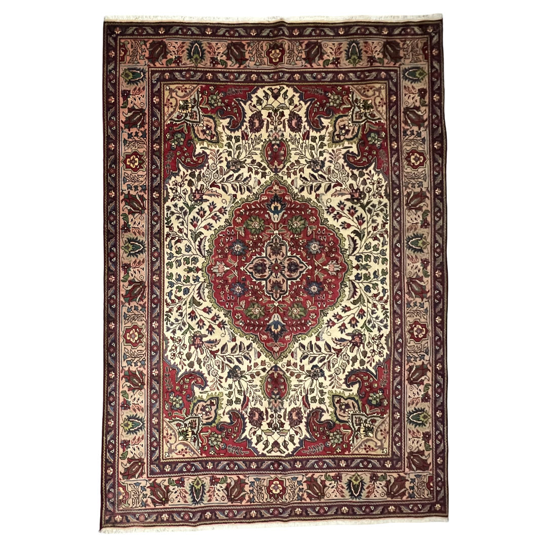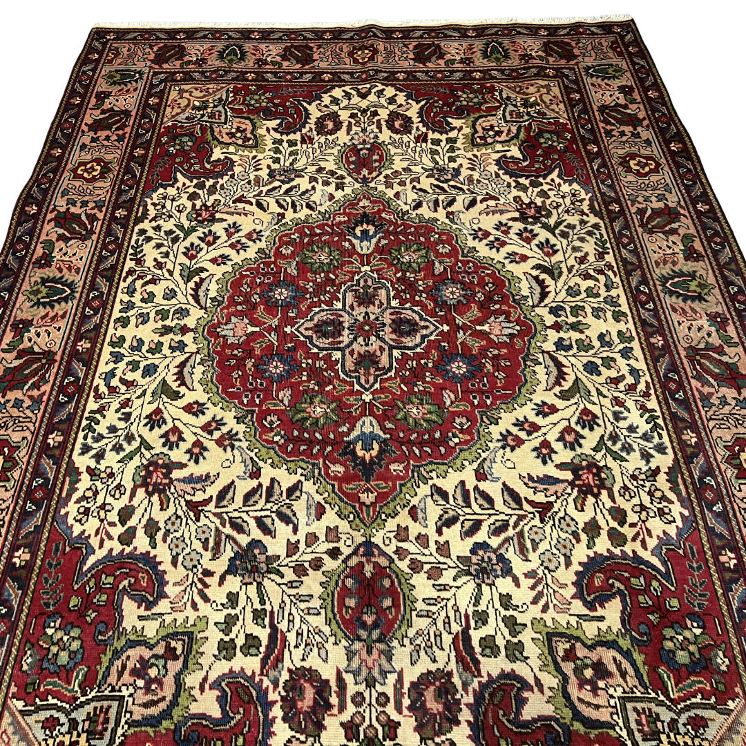 This Persian Mashad rug showcases the iconic Lachak Toranj design, featuring a beautifully detailed central medallion set against a rich red field. The navy corner spandrels create contrast and structure, giving the rug a strong and balanced appearance.