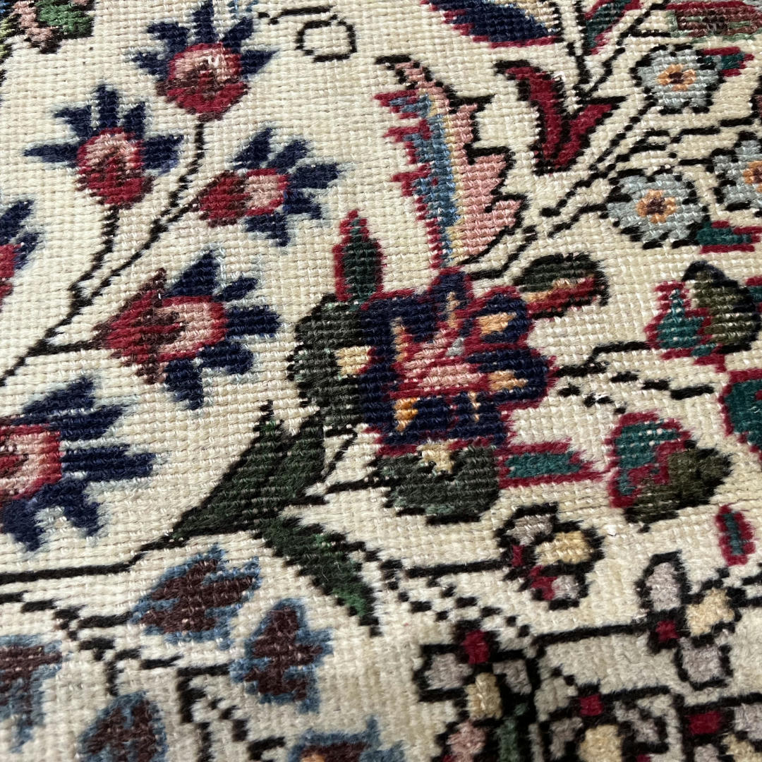 The field is filled with intricate floral motifs, typical of Mashad weaving, offering a classic Persian look that works well in both traditional and modern interiors.