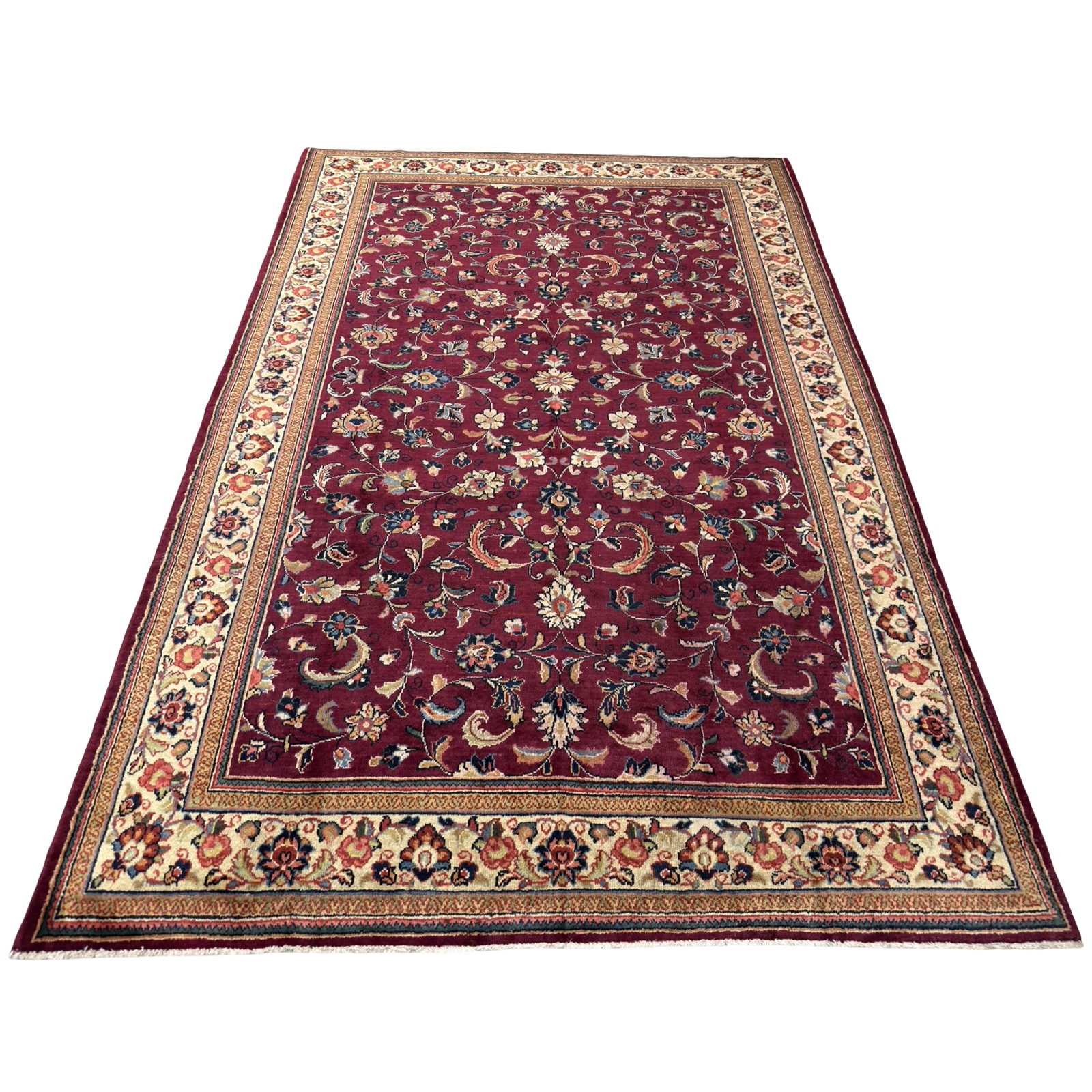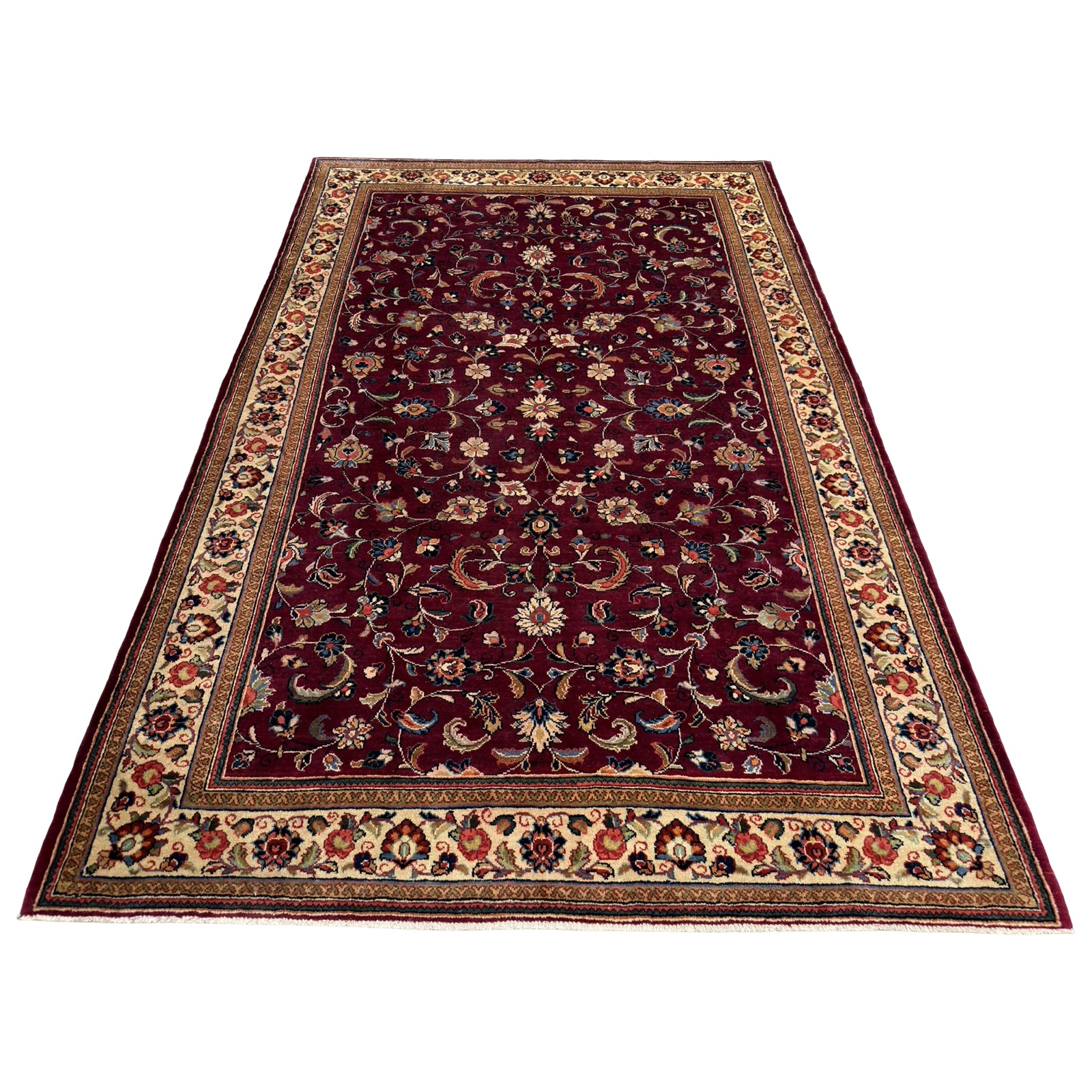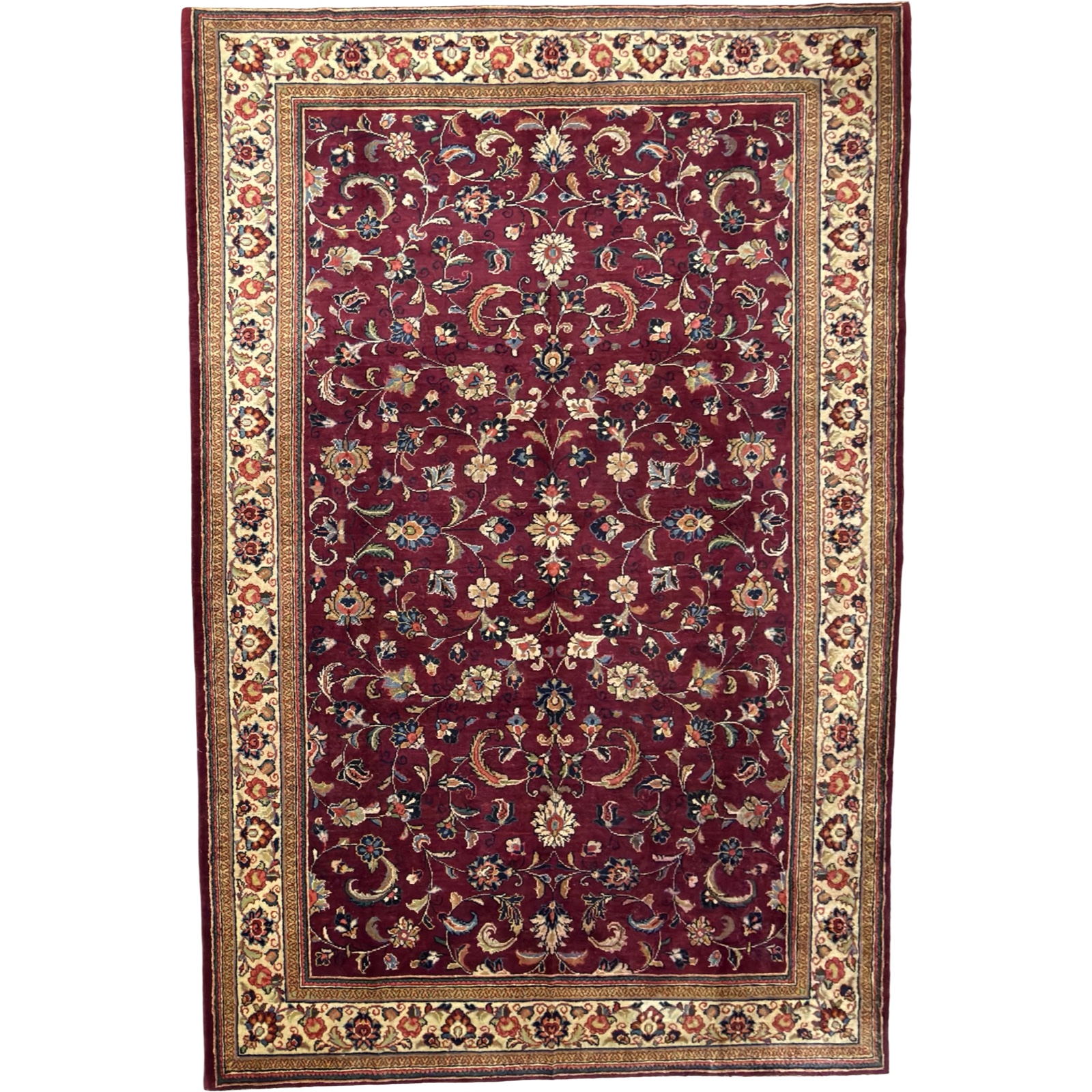 A classic Persian Sarough rug featuring an elegant all-over floral design set on a rich burgundy field. Delicate scrolling vines and finely detailed blossoms flow across the surface, framed by a soft ivory border that adds contrast and balance.