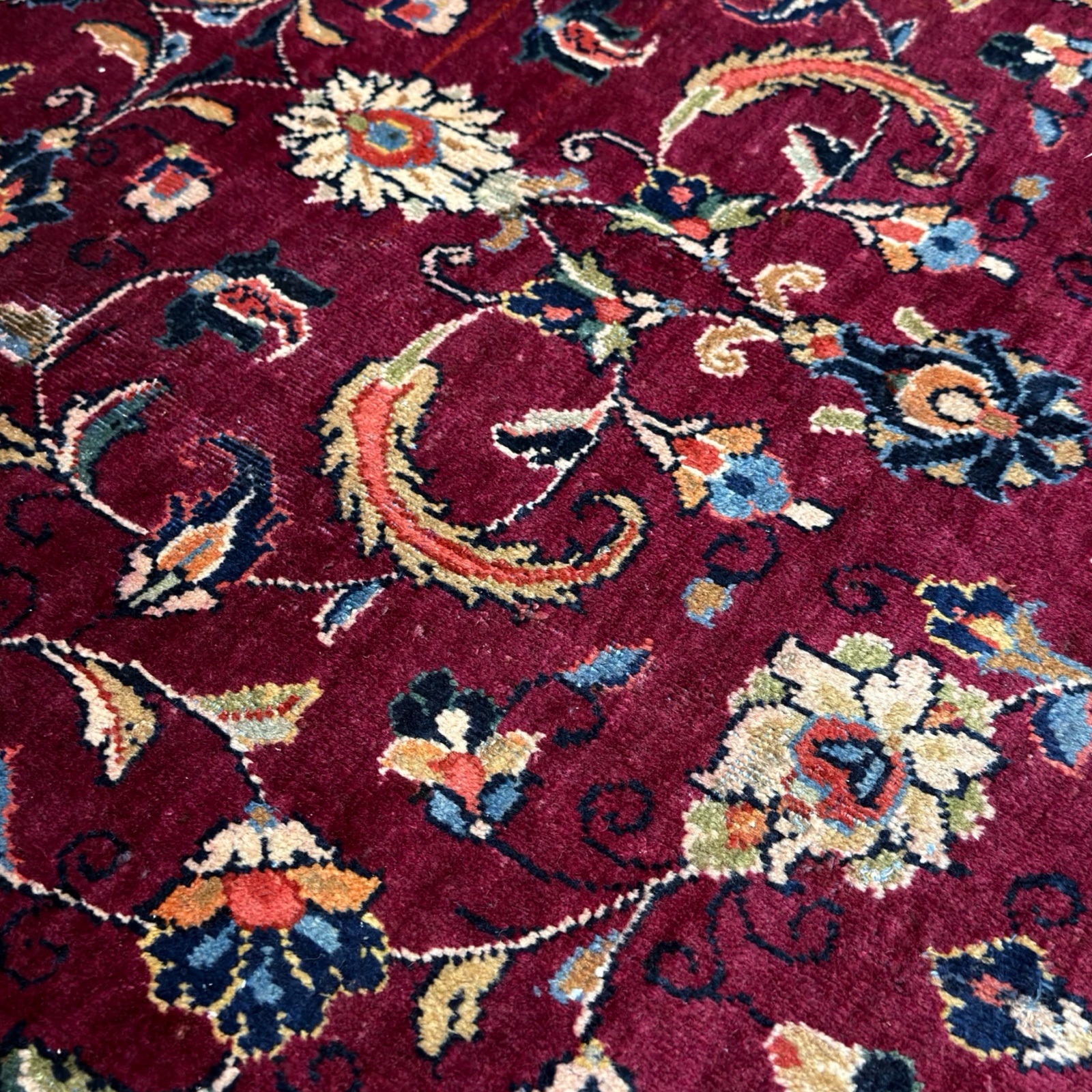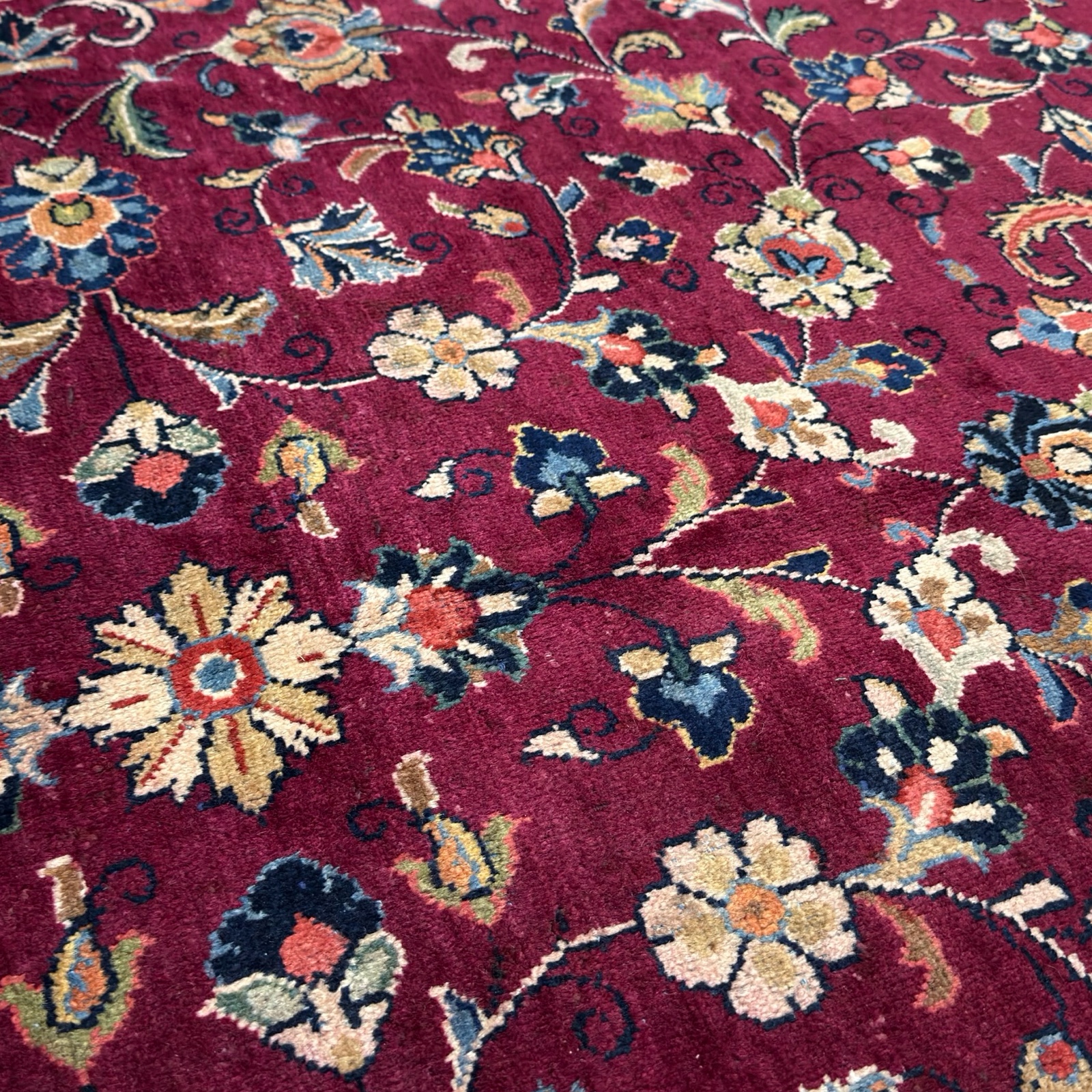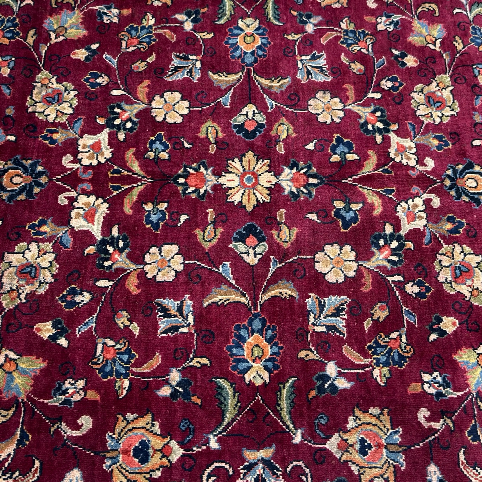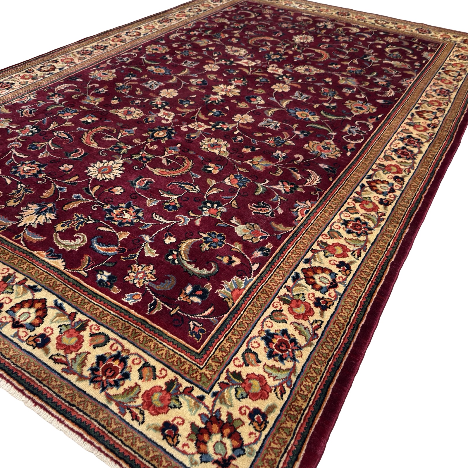 A classic Persian Sarough rug featuring an elegant all-over floral design set on a rich burgundy field. Delicate scrolling vines and finely detailed blossoms flow across the surface, framed by a soft ivory border that adds contrast and balance.