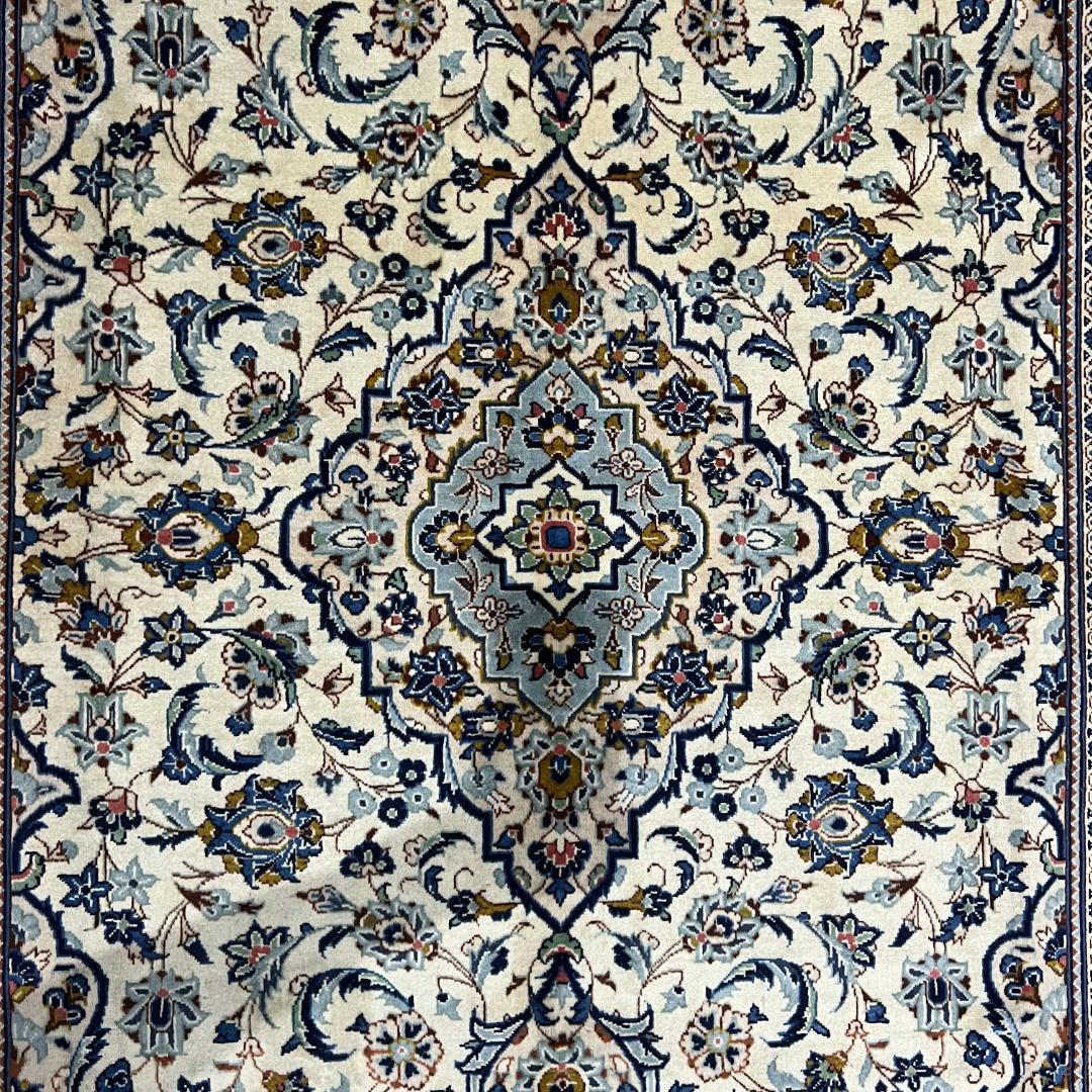 This Persian Nain rug is known for its refined design and soft, elegant colour palette. Featuring a light ivory background with detailed blue and beige floral patterns, it brings a calm and sophisticated feel to any space.