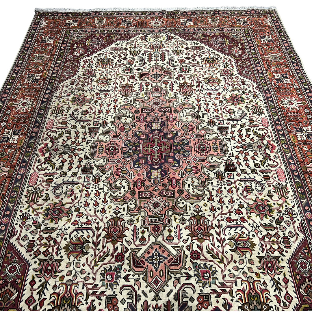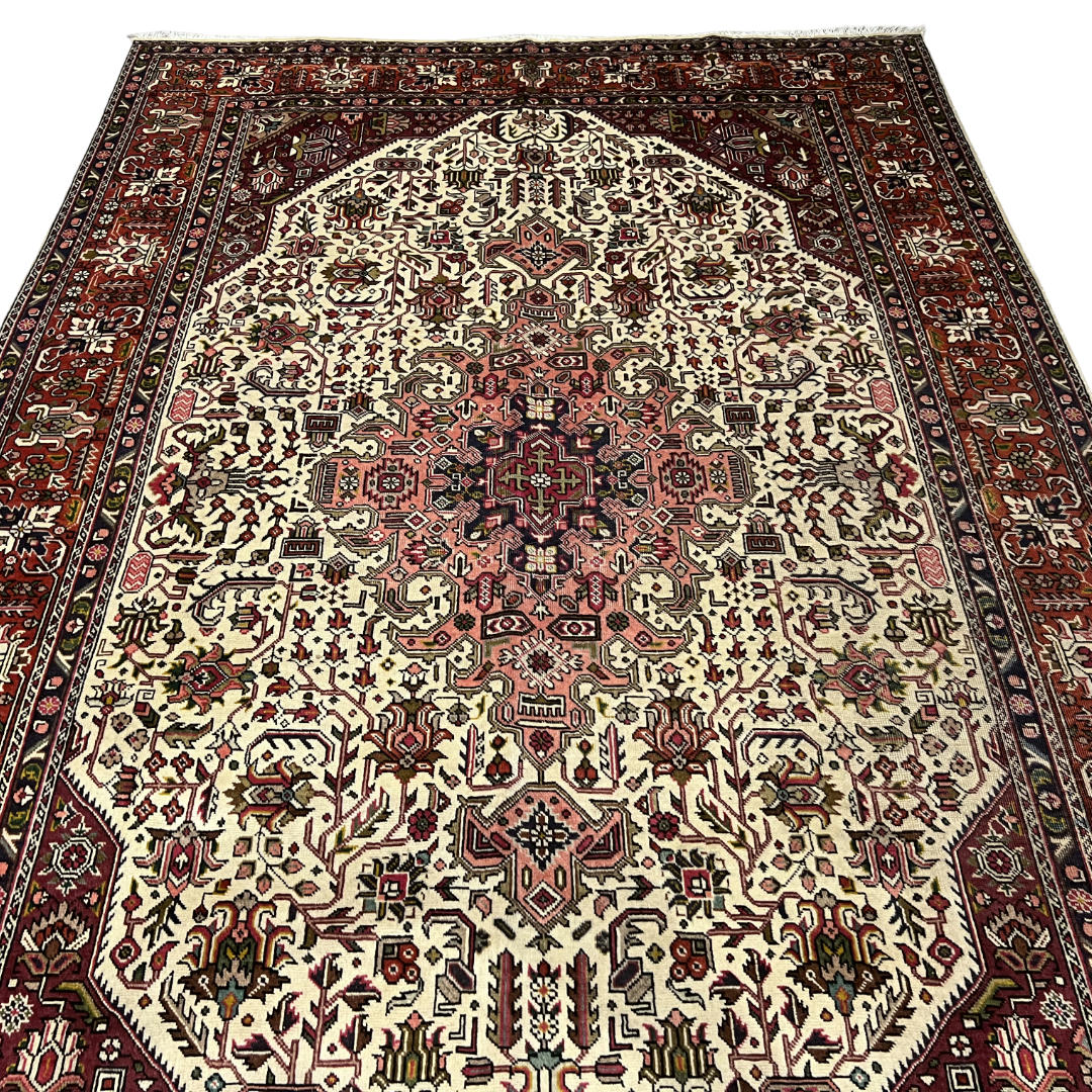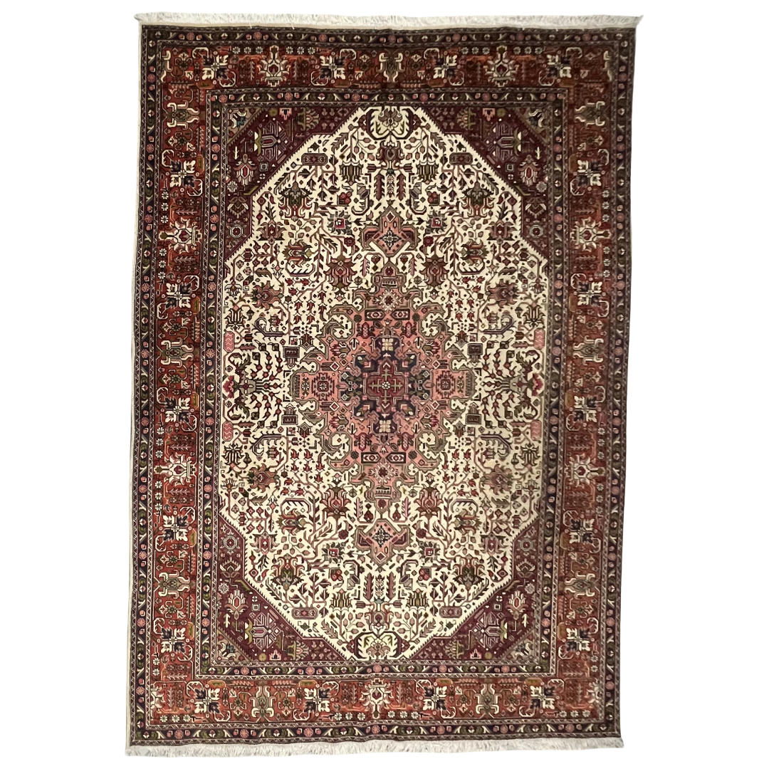 A bold Persian Tabriz rug featuring a striking geometric medallion design in rich red, navy, and ivory tones. Hand-knotted from quality wool, it offers sharp detailing with a strong, structured look inspired by Heriz-style patterns. Durable, timeless, and perfect as a statement piece for any space.