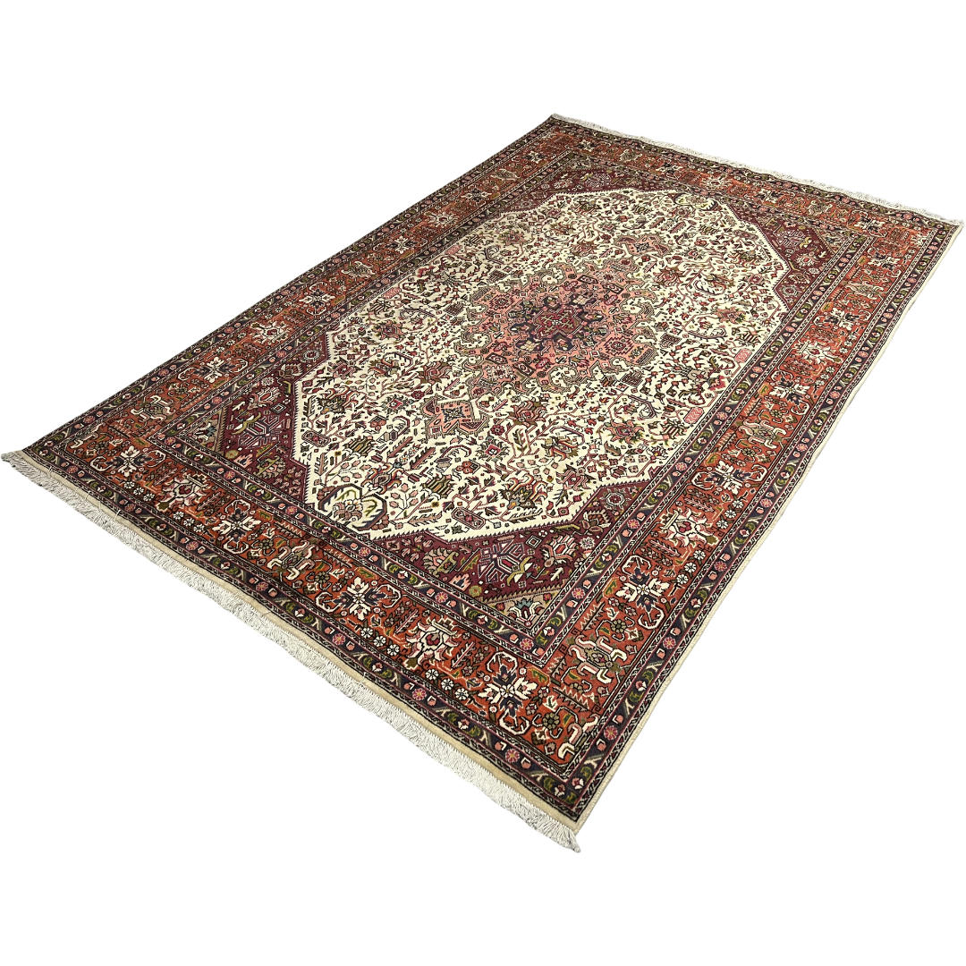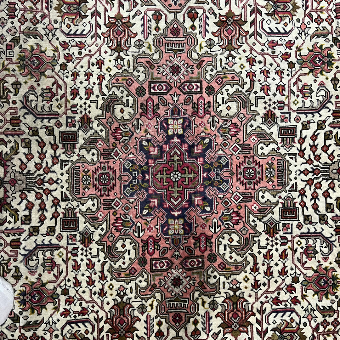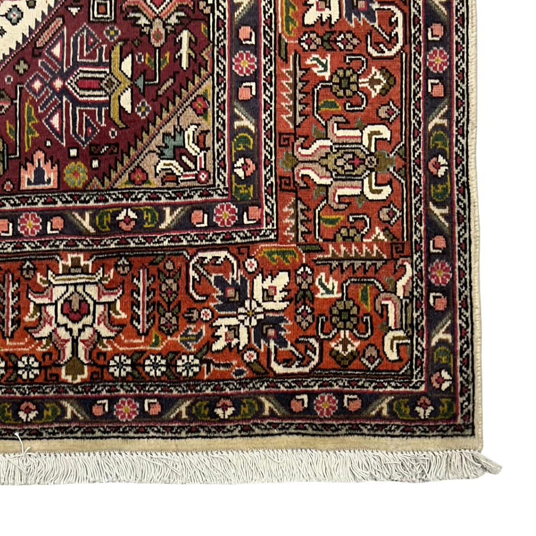 A bold Persian Tabriz rug featuring a striking geometric medallion design in rich red, navy, and ivory tones. Hand-knotted from quality wool, it offers sharp detailing with a strong, structured look inspired by Heriz-style patterns. Durable, timeless, and perfect as a statement piece for any space.