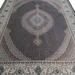This elegant rug features the famous Tabriz Mahi design, with a layered diamond medallion at the center and finely detailed fish-scale motifs across the field. The deep black base is beautifully balanced with shades of grey and ivory, finished with ornate floral borders.
