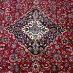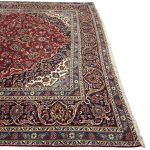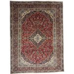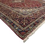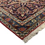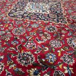 Hand woven using high-quality wool, this rug showcases the fine craftsmanship Kashan rugs are known for, with precise detailing and a soft yet durable pile. The combination of deep red, navy, ivory, and subtle accent colors gives it a warm, elegant presence that works perfectly in both traditional and refined modern interiors.