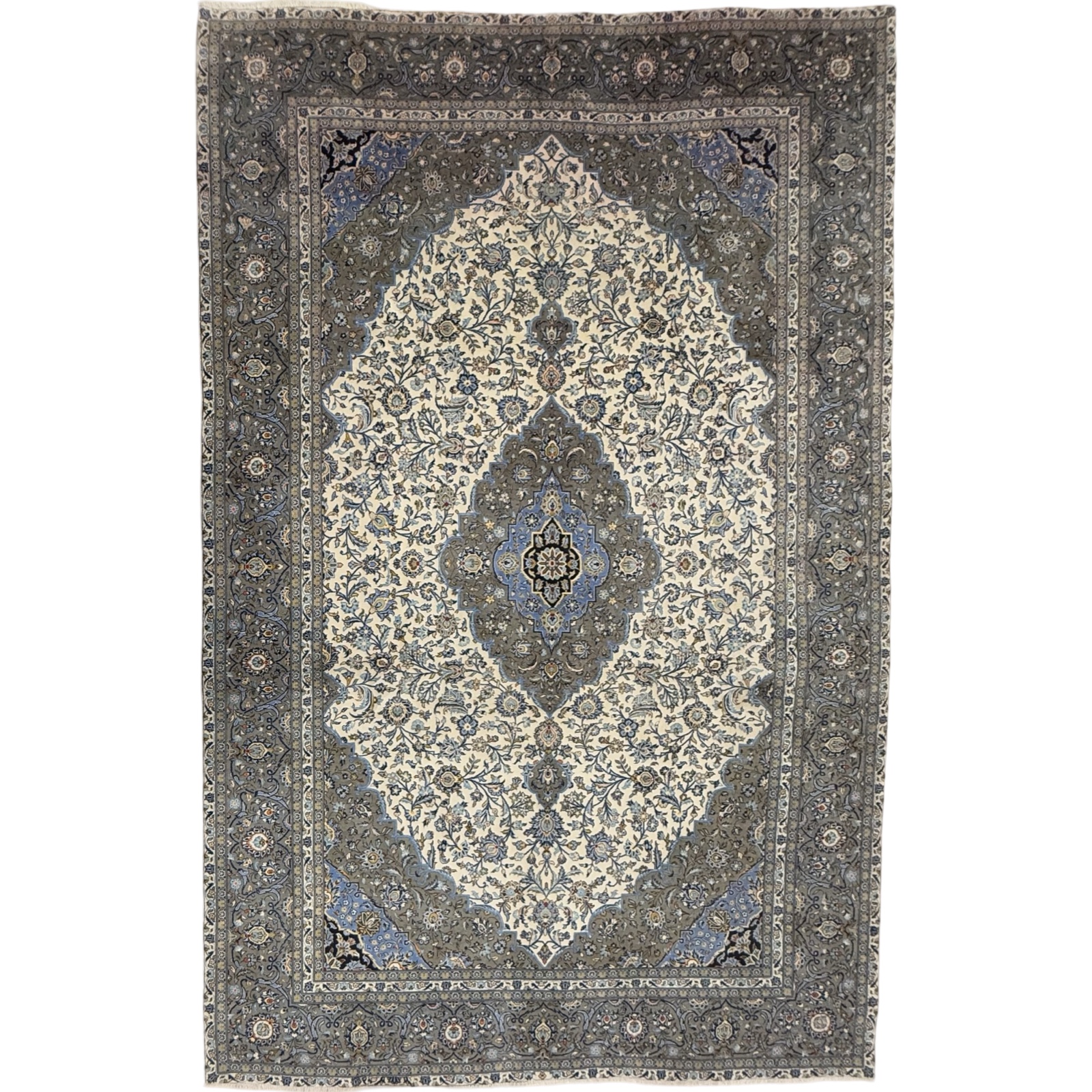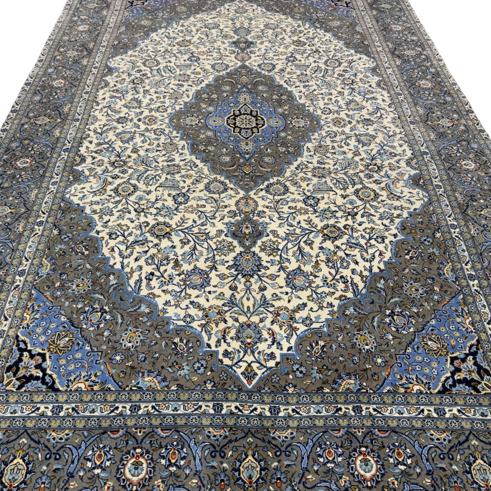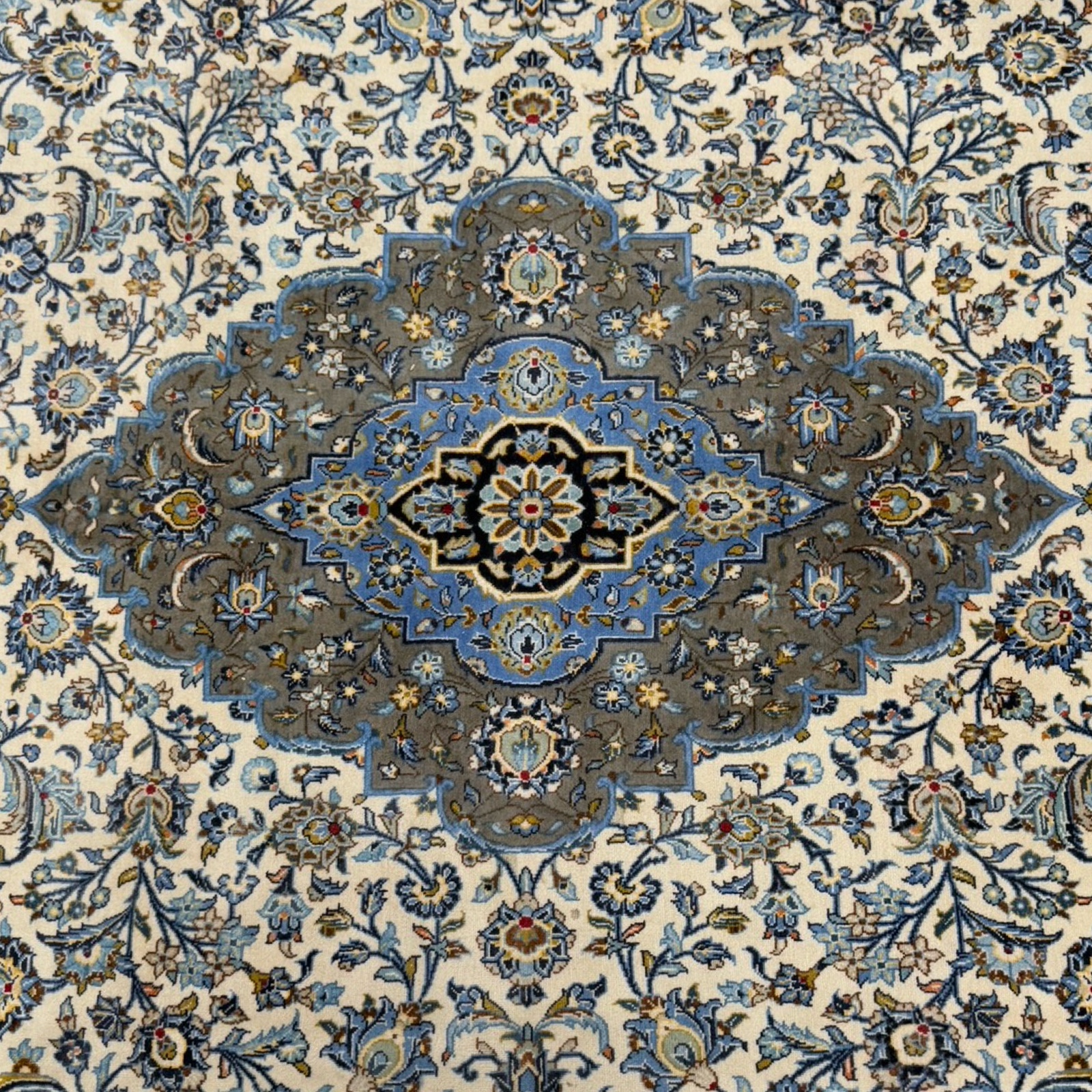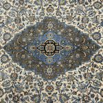 A Kashan rug typically features intricate, symmetrical patterns with a central medallion, surrounded by floral or arabesque motifs. The color palette often includes deep reds, blues, and golds, creating a rich, opulent appearance. The design is usually detailed, with a combination of floral patterns and geometric shapes. Kashan rugs are known for their high-quality craftsmanship and often have a luxurious feel, combining traditional Persian artistry with durability.