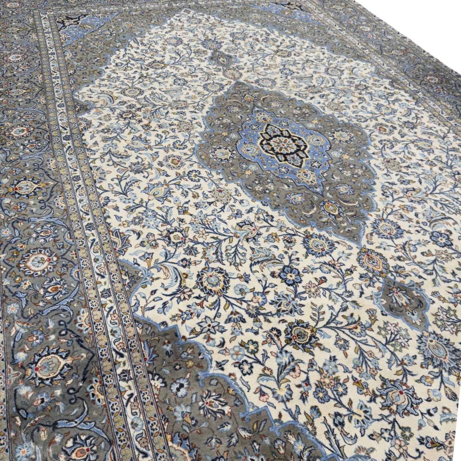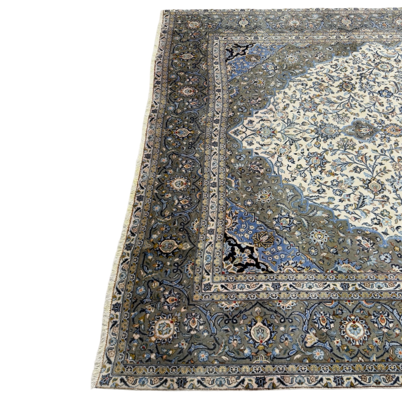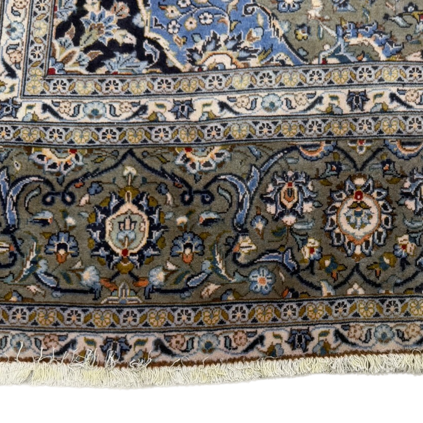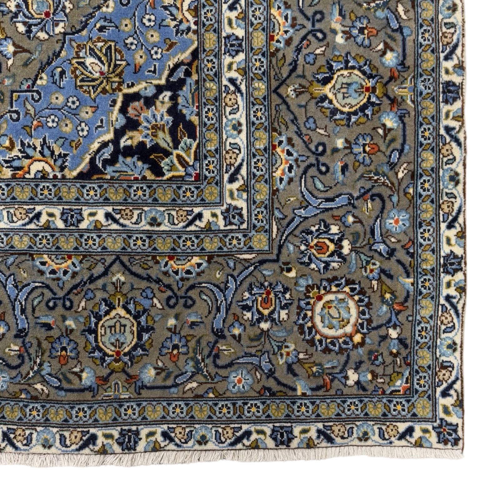 A Kashan rug typically features intricate, symmetrical patterns with a central medallion, surrounded by floral or arabesque motifs. The color palette often includes deep reds, blues, and golds, creating a rich, opulent appearance. The design is usually detailed, with a combination of floral patterns and geometric shapes. Kashan rugs are known for their high-quality craftsmanship and often have a luxurious feel, combining traditional Persian artistry with durability.